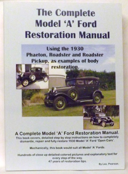 The book also covers basic body work, media blasting, Model A full engine reconditioning, shock absorber restoration, gearbox and diff restoration, body painting, aligning the body, purchasing upholstery kits, top bows, tops and side curtain installation, pin striping, etc etc. All covered with colour pictures and text.